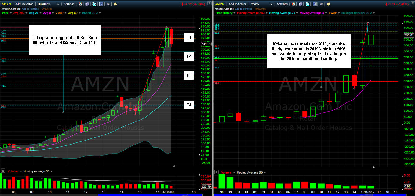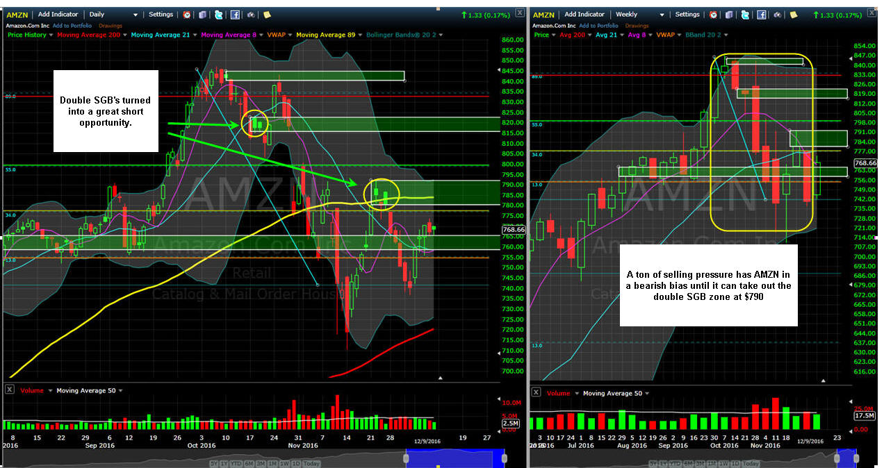 =================================================================================================================================================== 12/11/16 - SGB short signal strikes again as AMZN dropped in a second one after this post then down it went like a falling rock that turned into a nice Bull 180. Now the stock finished the week with a SGB DOJI so I am expecting an interesting move as we head into the final weeks of 2016 trading. This week is the FOMC announcement which is most likely priced in for a rate hike. Will this effect AMZN? I do not think so, but it can influence the amount of movement we will get. If the stock does open lower this week, I plan to sell a few Bear Call Spreads and pick up a Butterfly at the 200MA on the daily chart. Looking over the weekly Bull 180 I see the stock made it to T2 but could not touch T3 before profit taking kicked in. Since the stock topped out, there have been 6 out of 8 weeks of selling candles and until the stock can get back over $810 it is a short bias on any rallies. January earnings will be a big quarterly report for AMZN because it is the biggest selling season for the stock and will set the tone for 2017. Long term, it is well publicized this stock is and will be one of the biggest growth companies in the coming decade so we will have plenty of opportunities to profit and tons of volatility to Lotto and White Whale fish—I am going to make AMZN on of my 2017 Compounder series trades.