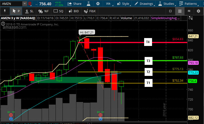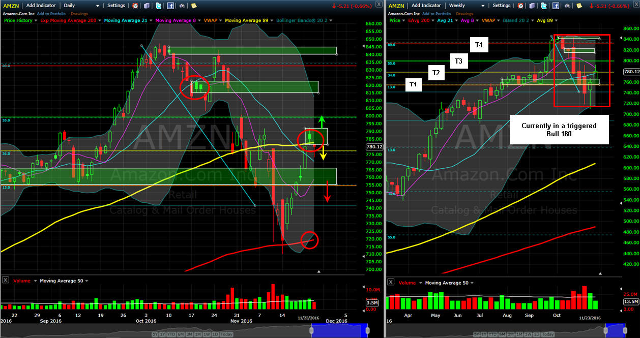 ================================================================================================================ 11/24/16 - A solid move over the SGB zone that produced another HUGE LOTTO WINNER! Now we have a SGB spinning top in place that will be my pivot point for future AMZN trades as we head into December trading. We know this is the big retail selling season for AMZN, so if the Black Friday news is positive, I am expecting the stock to gap over that SGB as early as tomorrow. My initial upside target at $815 and if news is lack luster, then we have our short entry/exit points and my downside target is the 200MA. The weekly chart has AMZN currently in a triggered Bull 180 and has already reached T2 so positive news and its headed to T4.