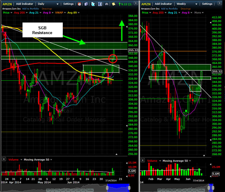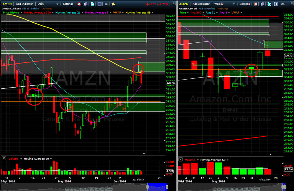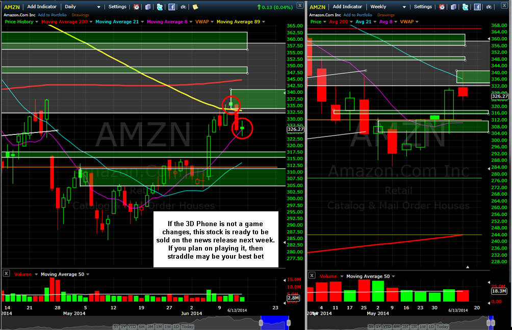 ============================================================================================================= 510/14 - The news is just too good right now to get any selling; however, AMZN did pause right at the 89MA on the daily chart and 21MA on the weekly chart. If the stock takes that out then the 200MA or the SGB zone above it on the daily is the best target where the stock will stall until the actual 3D phone reveal on the 18th. AMZN has been upgraded by GS to a Conviction Buy from Buy and we know that means the top is about to be set....lol....the stock is currently up $7.00 in pre-market so we will have to see how the markets are reacting. The best way to play this one is with Spreads because the calls will pumped up on the excitement so if you are not long yet, then FISH for a lower entry price at least 21 - 34% below the current ASK. DO NOT CHASE, that will only frustrate you to no end. If you want speculate on a weekly Lotto Play, then wait for the open and hope we get an initial pullback in the first 15 minutes of trading; then we buy the weekly calls 3% OTM which will be the $350 but you want to buy the $345's just in case the stock really takes off and hits the high side of the SGB range at $350, that way you are ITM and have a guaranteed fill when you want to sell. Current Theoretical value at the open is $2.79 so I would fish for a entry price of $1.25 and hold on if you get filled for the All-or-Nothing Lotto Play.