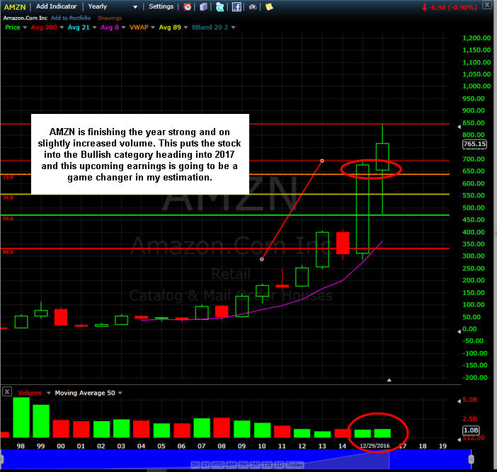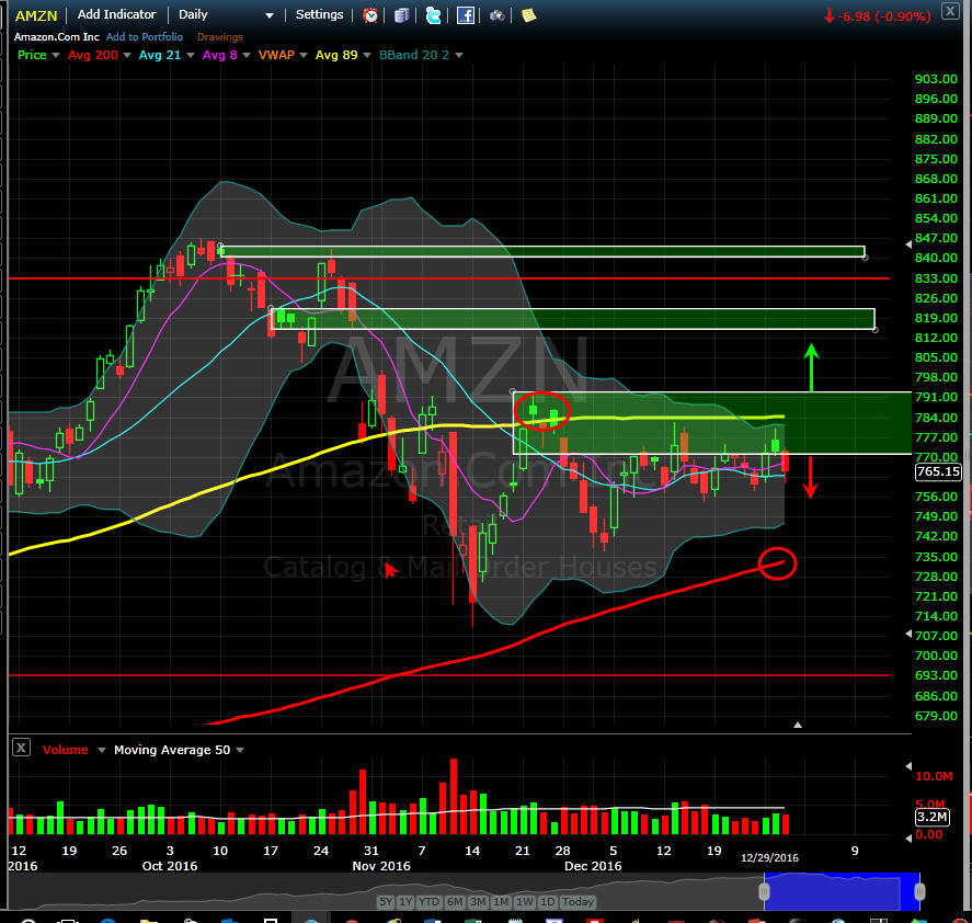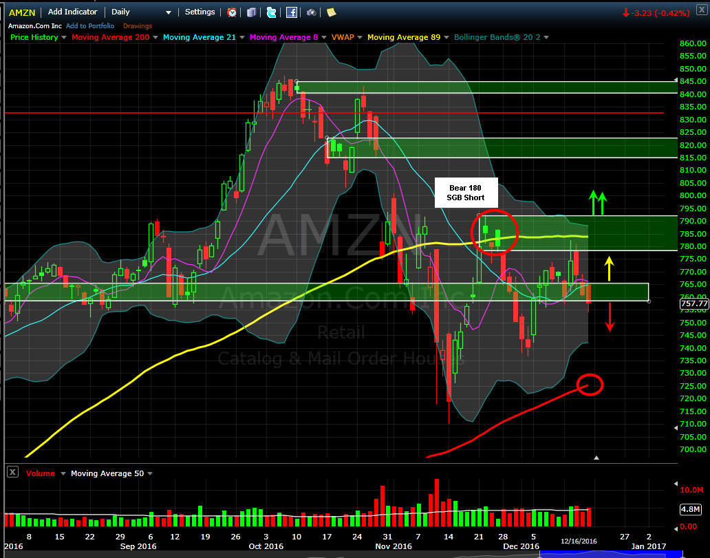 ======================================================================================================================================== 12/29/16 - Final trading day for 2016 is upon us and AMZN looks poised to take a dive from the current SGB zone. On Wednesday, the stock failed the 89MA and put on another SGB so now we have yet another perfect pivot point to trade from. If it moves over $791 get long and strong and under $755 short with caution. As we get underway in 2017, it is looking like the ether of retail will play out for the stock and all eyes will be on their other business models particularly AWS subscriptions. We all know the company has lost money for years and it was only in 2015 they started to actually post positive quarters, but if you dig into the numbers, you find their "retail" business is by no means a cash cow, so if they do not continue to diversify into other revenue generating venues like AWS, the lofty valuations of this stock will wear on institutional investors and we could see a massive exodus in the future on a miss. Right now, this stock triggered short today off the SGB zone and the 200MA is sitting about $30 lower, so this could be an interesting next couple of weeks for this stock, and I plan to be fishing for calls at the 770 area on dips. Now if the stock decides to take off next week, then I will be selling premium and picking up calls under $800.