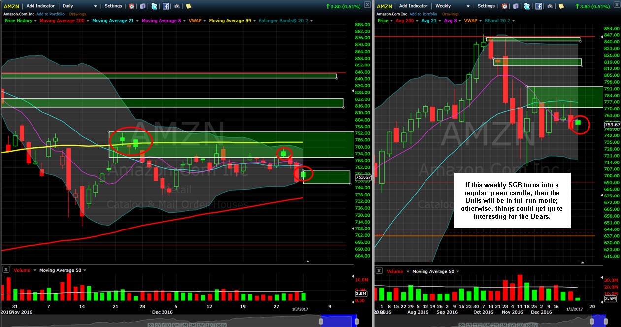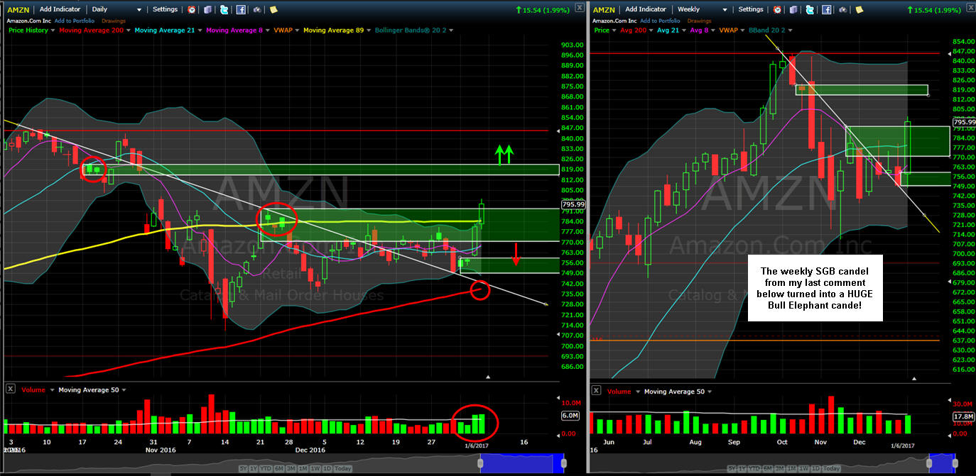 ================================================================================================================================== 1/8/17 - BAM! The SGB was taken out and up goes AMZN aggressively and boldly. Friday was a massive White Whale play on the call side as I posted put plays thinking the employment report might have disappointed investors and crushed AMZN...uh...nooooo way Jose. The only disappointment was if you were not fishing for the calls, so that is why you must learn my strategies and begin to make some of your own trades because I can certainly make some errors on direction from time-to-time. What I did point out on the WW charts page was that I bought into AMZN calls on Thursday night at the close, and unfortunately, I did not have time to post that trade to the site. Typically, I do my best work after markets hours and very late in the late evenings—like I am doing right now as I type this at 12:38AM PST Monday.