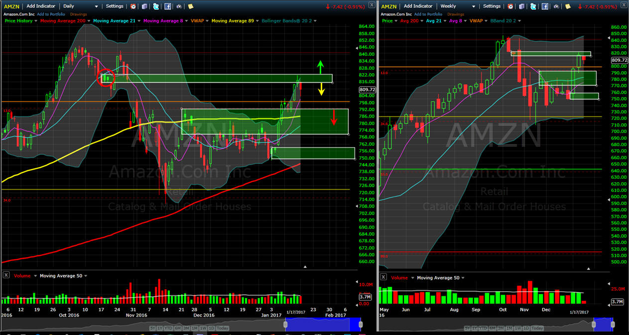 =========================================================================================================================== 1/17/17 - A very nice move back over the $800 benchmark and a dead stop at the SGB zone on Friday. Today the stock sold off on good volume as there is no doubt investors are taking profits ahead of the inauguration. As of today AMZN is a SGB short bias back down to the 89MA and if things get really ugly, we could see a full drop back to the 200MA. If there is no major issues with the Trump inauguration, then I will be getting long strategies over $823.55.