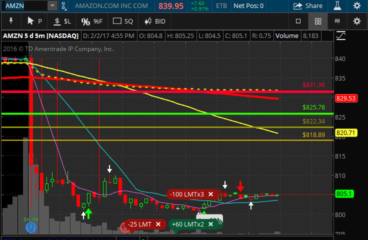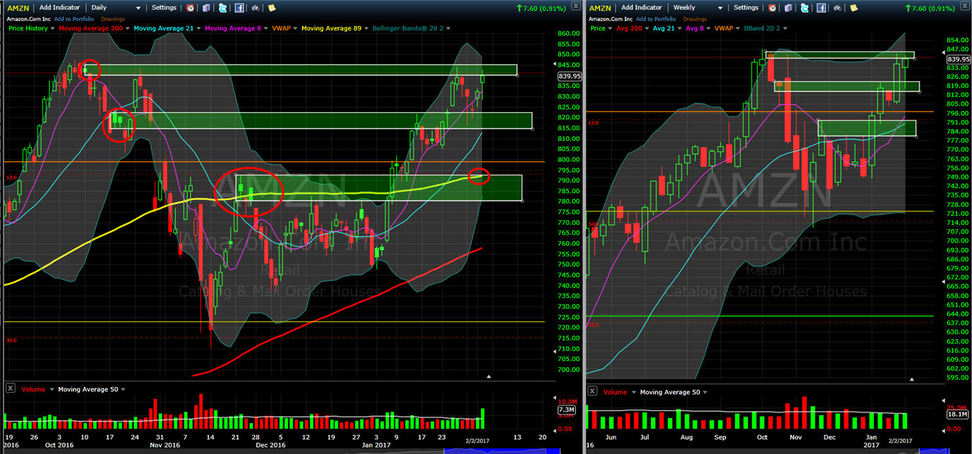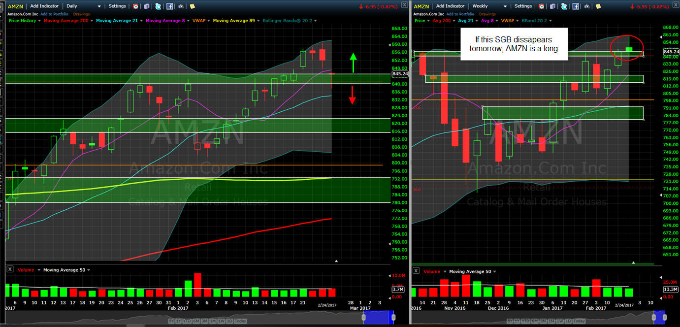 ====================================================================================================================== 2/12/17 - Post earnings dip was bought and now AMZN moves back over the SGB zone making it a long over $823.34 and short under $816.00. With continued up side action, look for profit takers to kick in at the $840 level. Now if the stock does open back into this SGB zone, then I will be ready to hit the short button and look for some Lotto trades later in the week.
