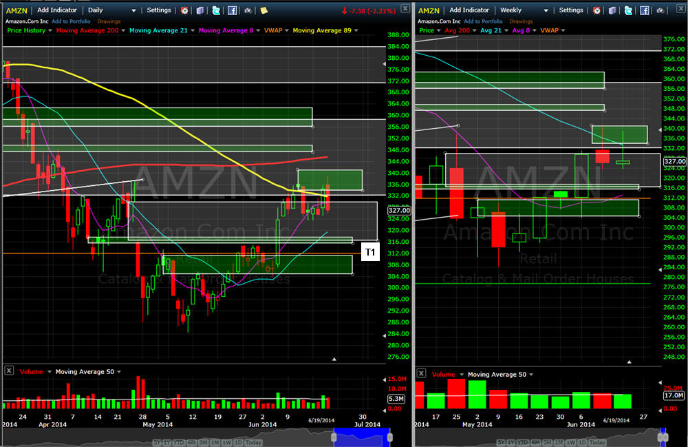 ================================================================================================================ 6/30/14 - The news story on CNBC "Amazon Rising" over the weekend, did not give any rise to the stocks price today. The stock is most likely going to trade in a range until the next earnings release so you can consider doing some Iron Condors to collect some Theta premium. I was filled on my OTM Bull Call Debit spread so I will wait to see how the rest of this weeks plays out. Now if AMZN does take a dip, I am a buyer at my T1 line around $310-$312 if the markets are rising. There is three SGB zones overhead and the stock is trading UNDER the 200MA and 89MA which makes is extremely vulnerable to lower prices.