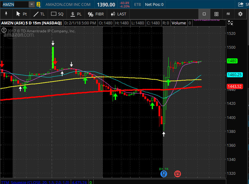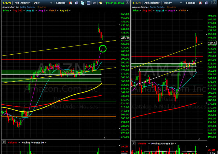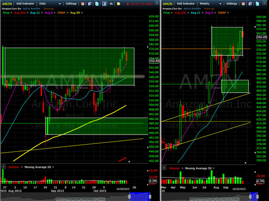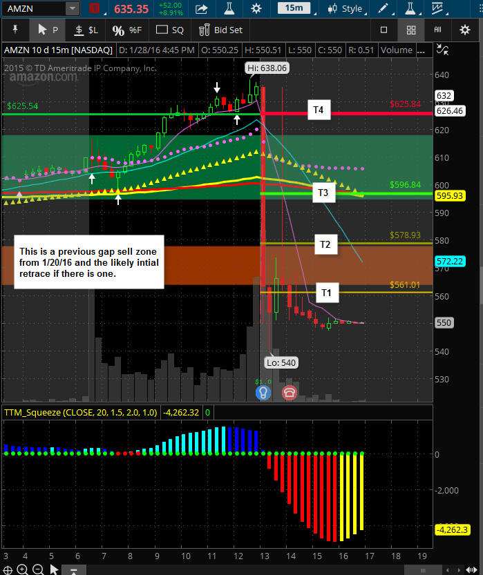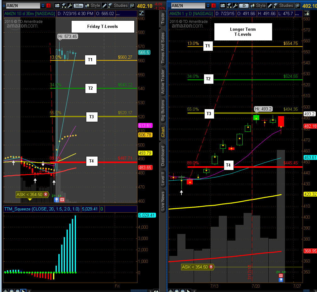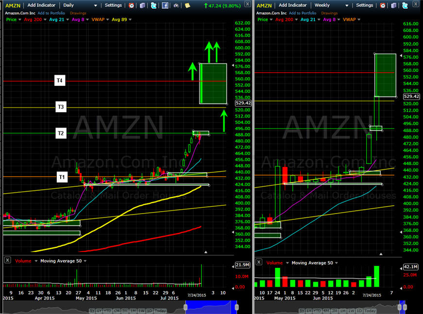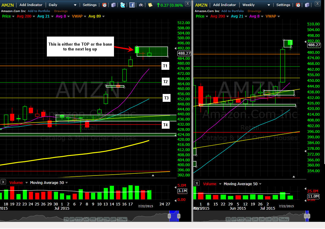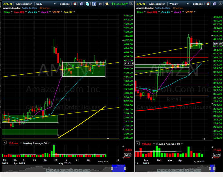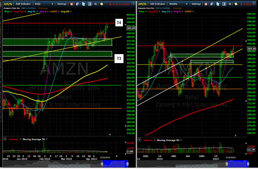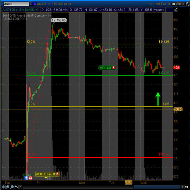 ============================================================================================================== 4/29/15 - Profit taking is has taken hold as investors move into the end of April trading. I am looking for AMZN to pull back a little further, preferably back to the 8MA on the daily chart or T3 on the 15 minute chart is where I will try a couple of long plays.