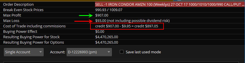 I am doing a $10 wide spread and selling it for a $9.90 or higher credit and I plan to risk up to $1,000 (10 contracts) for a maximum return of 8 - 9K should the stock "pin" at or near $1,000 on Friday.
