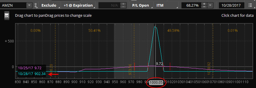 To get the maximum profit, AMZN needs to "pin" at $1,000 on Friday per the analysis graph above. Under 990 or over 1010 and it is a 100% loser...DO NOT BET THE FARM ON THIS STRATEGY!