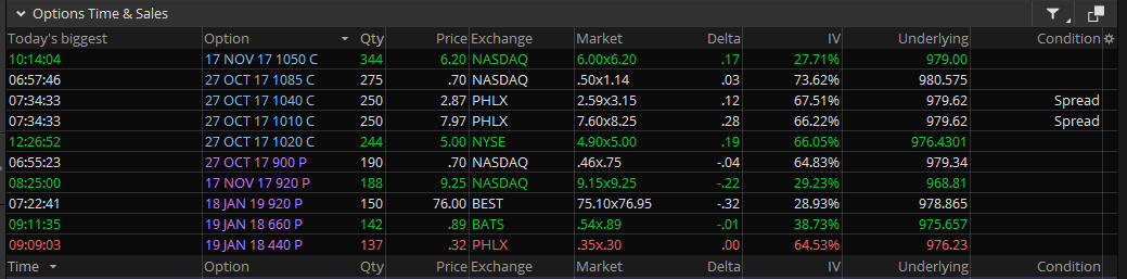 Open interest is on the call side with a ton of activity at the 1,000 price which puts the stock right around the MMM, so there is where I will place my ICU strike.