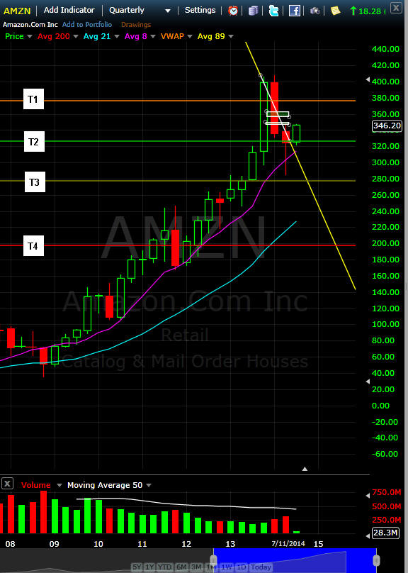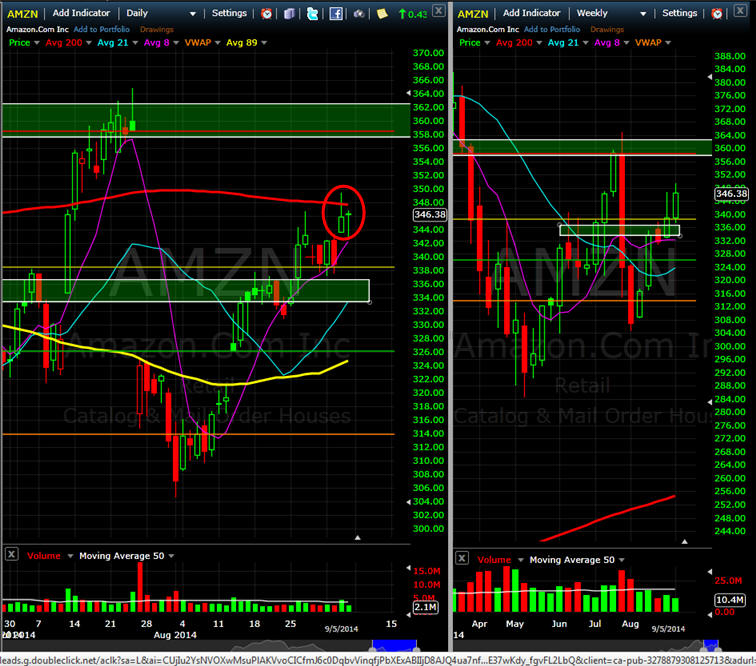 ==================================================================================================================== 9/7/14 - The test of the 200 has begun and if AMZN make a close over it, we could be on for a race to new all time highs. A failure, and the 89MA is the next logical stopping point so long as there is no negative news and/or crushing markets.