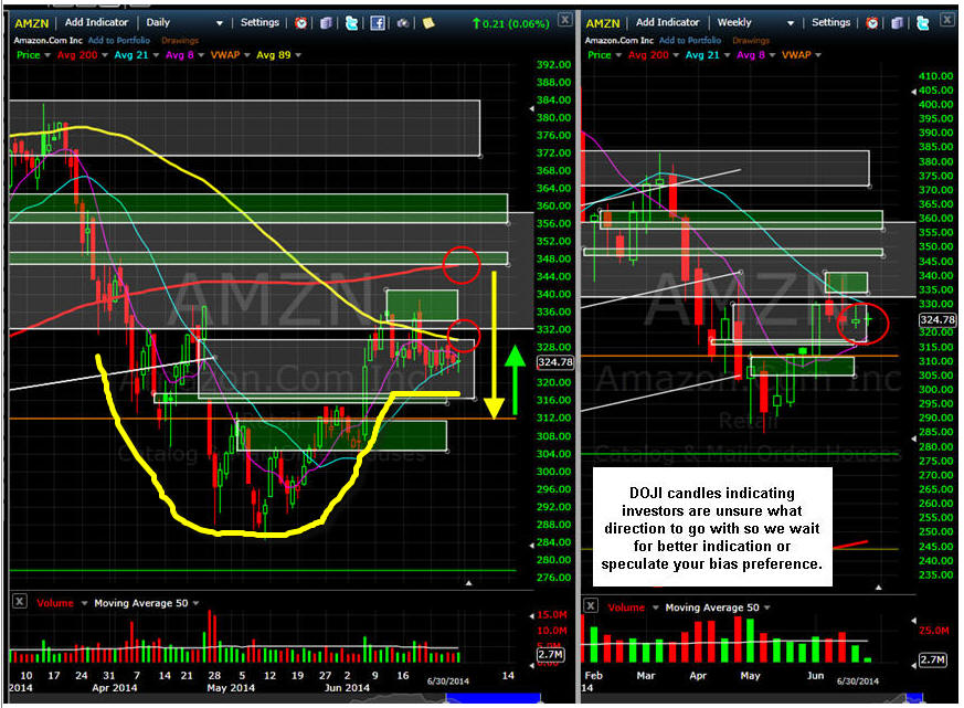 ================================================================================================================ 8/12/14 - We are now at the 89MA and we have had two DOJI candles indicating a move is about to happen. Bias is LOWER, but AMZN has huge upside potential, and the latest rumblings from authors about their pricing practices has not have a negative impact on the stock so over 89MA we go higher. I am selling some Bull Put sep spreads and buying some Lotto Puts