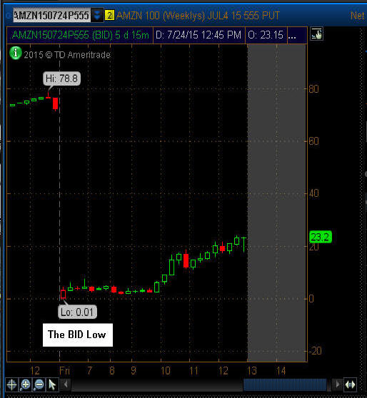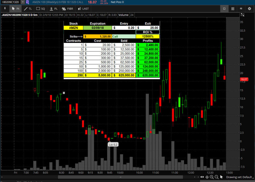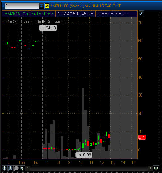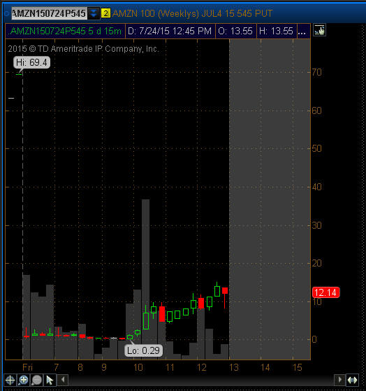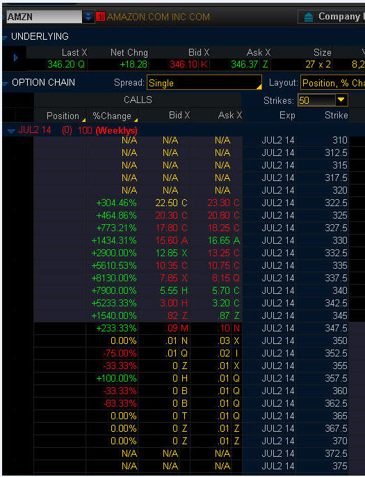 ================================================================================================================ 7/12/14 - News that AMZN is applying to the F.A.A for permission to fly Drone Delivery Systems and the stock exploded higher giving HUGE rise to the OTM options!! It pays again and again to just start fishing on OM options under an 8% move and BAM you will catch some huge winning trades over time. I had a Bull Call Spread trade on that made big profits, but dang, I was not fishing in this one yet—I will be taking those profits tomorrow.