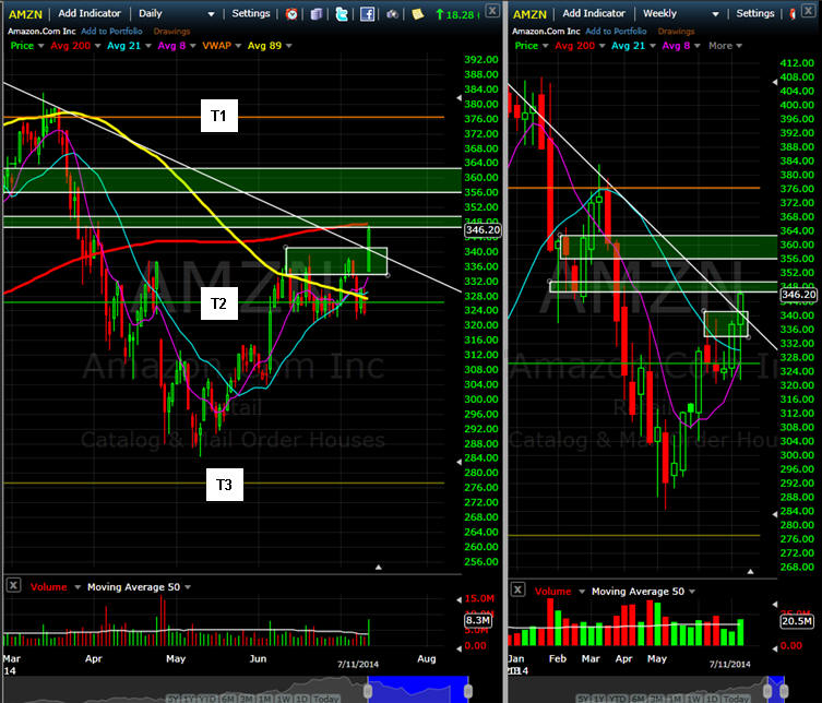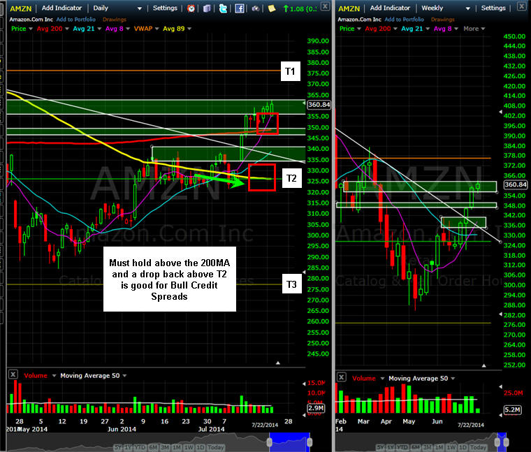 ========================================================================================================================= 7/13/14 - Will there be follow through this week on the price explosion in AMZN? Usually there is a pull back test the resolve of the bears, so we will have to wait and see how the stocks opens tomorrow. It did stop dead on the 200MA and if the stock does close over that, then we are looking for a move high if the markets are strong and earnings start kicking in too. I suspect investors may be excited to get in ahead of earnings because AMZN has consistently gotten a pass on weak to no earnings. If the stock holds Friday's rally, then start selling some Bull Put Spreads and we will wait until earnings to fish for some Lotto trades. If the rally continues, then I expect the stock to test my T1 line and or surpass it if earnings are met or exceeded.