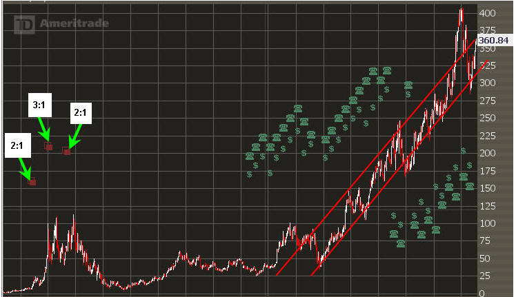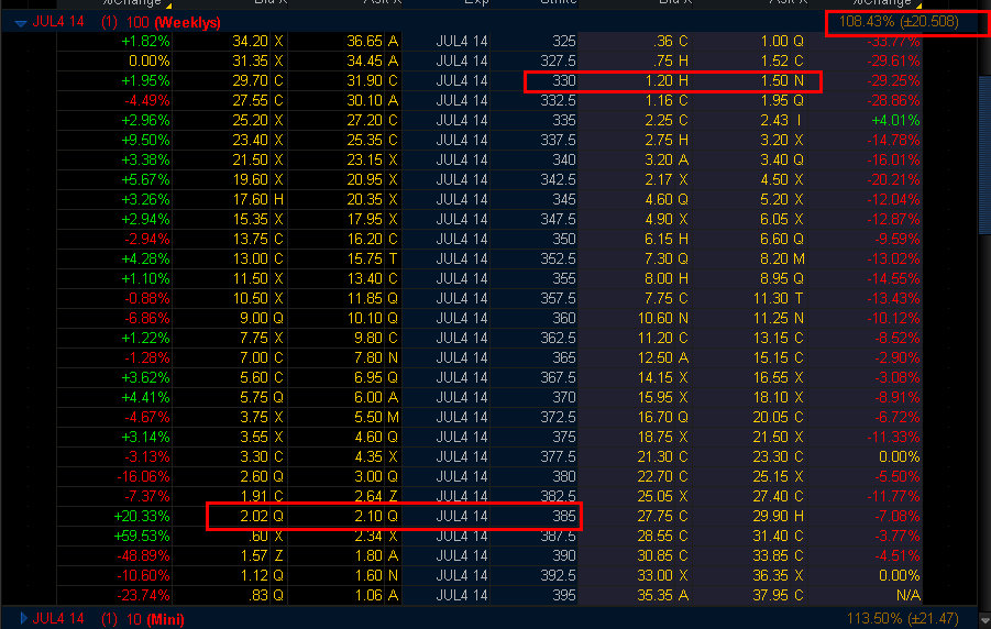 ============================================================================================================= 7/23/14 - Holding inside the SGB zone on the daily and a perfect DOJI on the weekly indicating investors are NOT bullish on this stock. With the IV nearly 100% buying any Big $625,000 bet on the Oct 400's MMM estimated at +/- 21.30