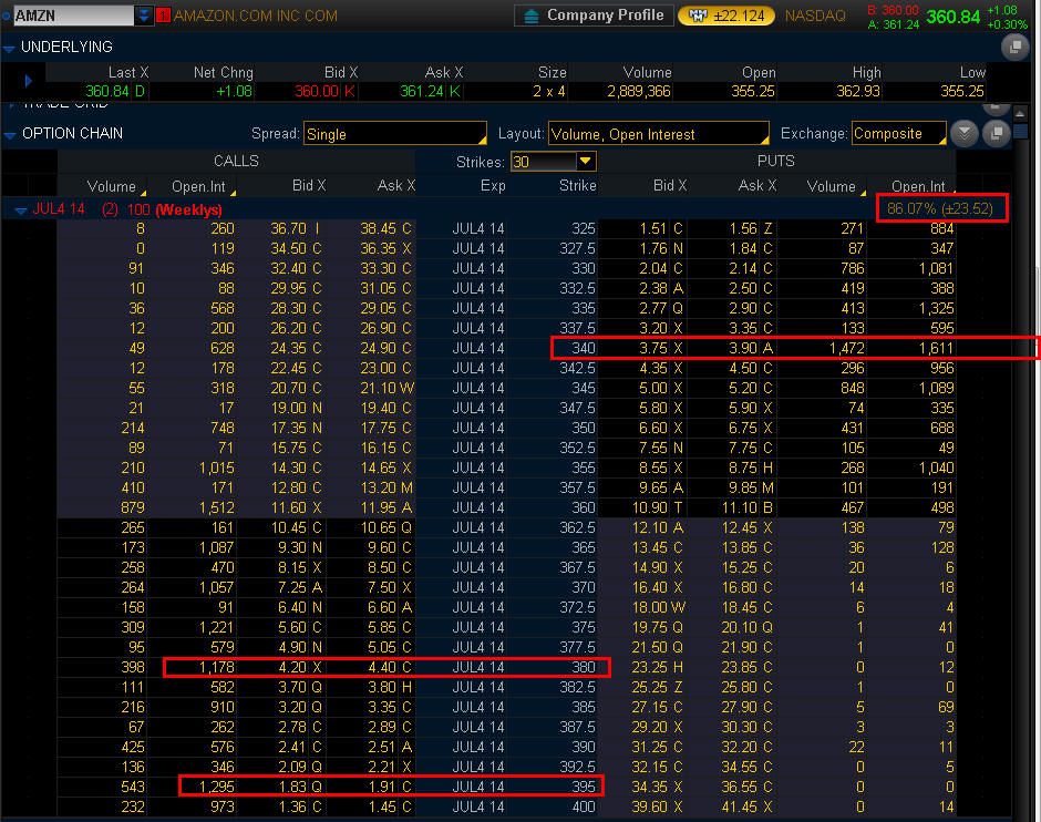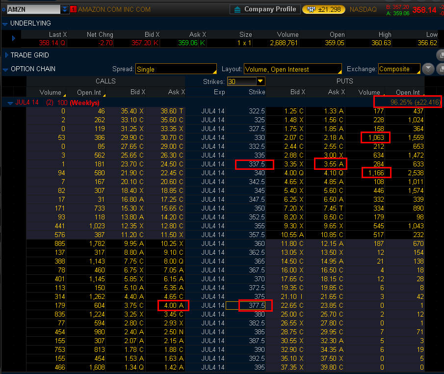 ==================================================================================================================== 6/12/14 - The good old GS SUCKER PUNCH upgrade strikes again. Like I said below, when GS steps in, you step OUTCH! Well, if you kept fishing, now you can get those 345's for a steal of a deal at $0.05 cents per contract. DO NOT BUY NOW, we needed the two day stretch to get the play working. If you think this current drop in price will not sustain, then buy some $340's for next week, but I would say a strangle may be the better play and that is what I plan to do next week. Yesterday turned into a SGB, so that is the pivot point for long plays OVER $342 and short entries on failed rallies at $335. My current Bull Call Spread was supposed to be a DEBIT so I apologize if you are confused but now you can get in for a much better price than I did. I picked up some June2 315 Puts at the close just in case AMZN gets crushed, but I am more inclined to see this as a news driven drop and AMZN could get short squeezed higher tomorrow or into next week. You may want to try and fish for a call side WW trade on the $330's tomorrow.