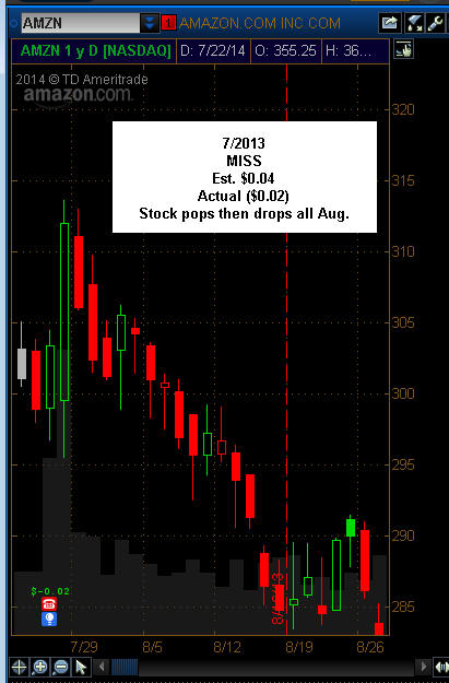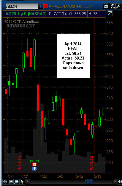 ================================================================================================================ 7/22/14 - Earnings are about to be released on AMZN and we know they usually get the pass because, well, they will the biggest company on the planet some day right? At least that is what investors believe, are told and want to invest for the long haul. I remember when this company started trading (yes I am that old...lol) and had you just bought 1000 shares at the IPO price of $18 back in 1997 and held onto your investment, you would now have 12,000 shares worth $4.3 Million bucks! Investing vs. trading can build wealth if you have time and pick the right stocks, so as you make profits from trade ideas here at OptionRadio, be sure to accumulate shares of the companies you profit on. Although this stock has its ups and downs, the trajectory is still in tact above $325.00 which happens to be my T2 line! No matter what direction AMZN takes we always trade what the market give us and I will be prepared to make profits! Looking over the current charts, the stock is dead stopped at my SGB zone and trading under my T1 line. This give me a bearish bias, but I know from hard and expensive experience, AMZN is not a stock you want to be careful shorting over earnings. With IV at a whopping 85%, the MMM is well priced into the cost of the options so it's a good candidate to sell premium spreads outside the MMM currently at +/- 22.18. If the stock does hit the MMM, that puts it potentially at $382 on the upside which is above my T1 or $338 which is above my T2. We have strong support at the 200MA, but the 89 is headed lower resting on T2. I do not think the company will get long term whacked if the report expected or even a slight miss, so pull backs are good bets for credit spreads above the 21MA on the daily chart or the 89MA. There was strong volume today on the 340 weekly puts so investors are showing signs they think AMZN will sell off. As you can see, the cost of DOTM calls and puts are so pumped up it's hard to buy in on either side. AMZN does have a track record for making strong moves at earnings as shown below, so we have some good opportunities, but it will take market support to get things really moving on the upside even if they beat. The bias is lower prices, so a gap up that fails to take out T1 is a short opportunity and over T1 is a cautious long The short interest is light and I do not think investors are all too concerned about selling the company especially since they came out with a smart phone and recently applied to use drones for some deliveries.