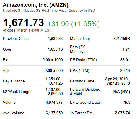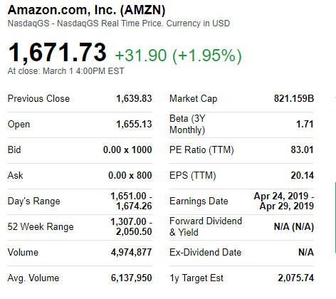 AMZN Stock Information Updated 3/3/19 |