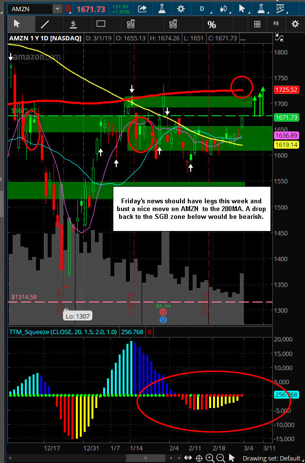 3/3/19 - Did you see the movement AMZN made on Friday? This stock has been in sideways channel for a few weeks with multiple SGB's and then on Friday the stock took off as news was released they are opening up multiple grocery stores that will offer food and other items to compete with the more mainstream food stores like Vons, Smiths, Sprouts etc.