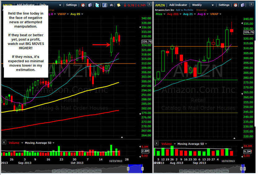 Blew right past the MMM expected move but it must hold above this move ($345.38) to keep the bulls interested and shorts squeezed. ======================================================================================================= 10/23/13 - I had my earnings dates mixed up. Tomorrow is AMZN earnings and investors were scared off today with negative news they may miss this time bigger than expected and get a move lower. Hmm, sounds like the typical manipulations to me. I mean, really, come out with negative news statements the day before earnings? Fishy, very fishy. Either way, I plan to have puts and calls in place and I will be doing a WW trade on Friday. Get ready to make some Profits UP!!