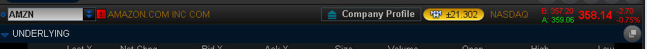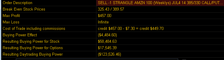 So, that puts AMZN at approximately $379.44 on the upside and $336.84 on the down side. Heavy volume on the weekly puts today. Notice how the IV% is a staggering 95.25%! WOW, forget about buying OTM puts or calls, that's almost a 99% guarantee to lose unless AMZN moves a lot further than the MMM. We will fish for a WW play on Friday. The IV is just too high for me to buy calls or puts, so I am going to sell a strangle outside the MMM and collect some premium. Depending on how the stock trades tomorrow, I will consider a call and put, but I prefer to just fish for a White Whale trade Friday morning after I see how the stock reacts to earnings.