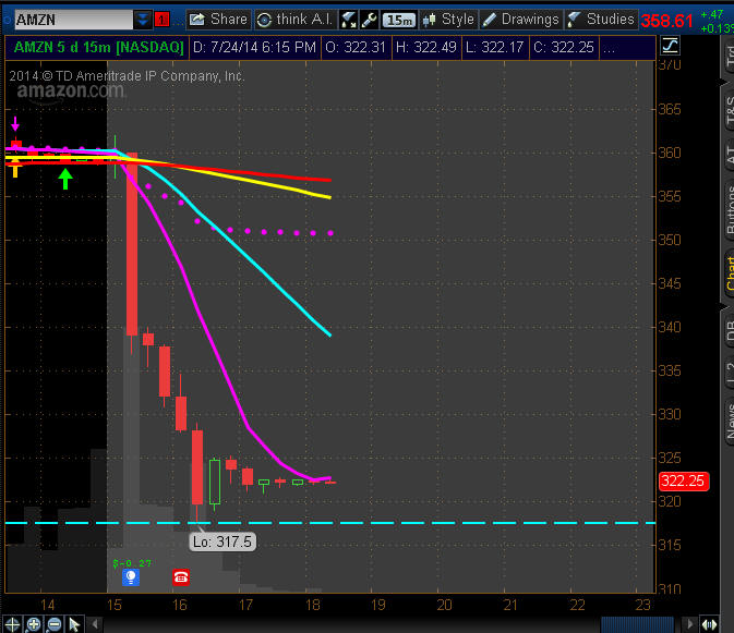 ======================================================================================================= 7/27/14 - Nice recovery off the opening lows but not enough to get my WW Calls or Puts filled. The strangle made a decent profit and now we need to see how AMZN reacts to the earnings sell off this week. Based on the controlled rise Friday and stop at the 89MA we could easily see a continued slide lower so If the stock does not stay over the 89MA in the first 15 min. of trading, then I am going with short strategies. ================================================================================================================ 7/24/14 - AMZN gets no pass this time as investors DUMP the stock $36.00 in after hours due to a much wider than expected miss. With the big drop below the MMM move, we may get a nice snap back rally tomorrow, so a White Whale trade opportunity is exactly what we will be fishing for! The IV was a whopping 108% so it will be a good lesson to see how that will effect the options at the open tomorrow.
