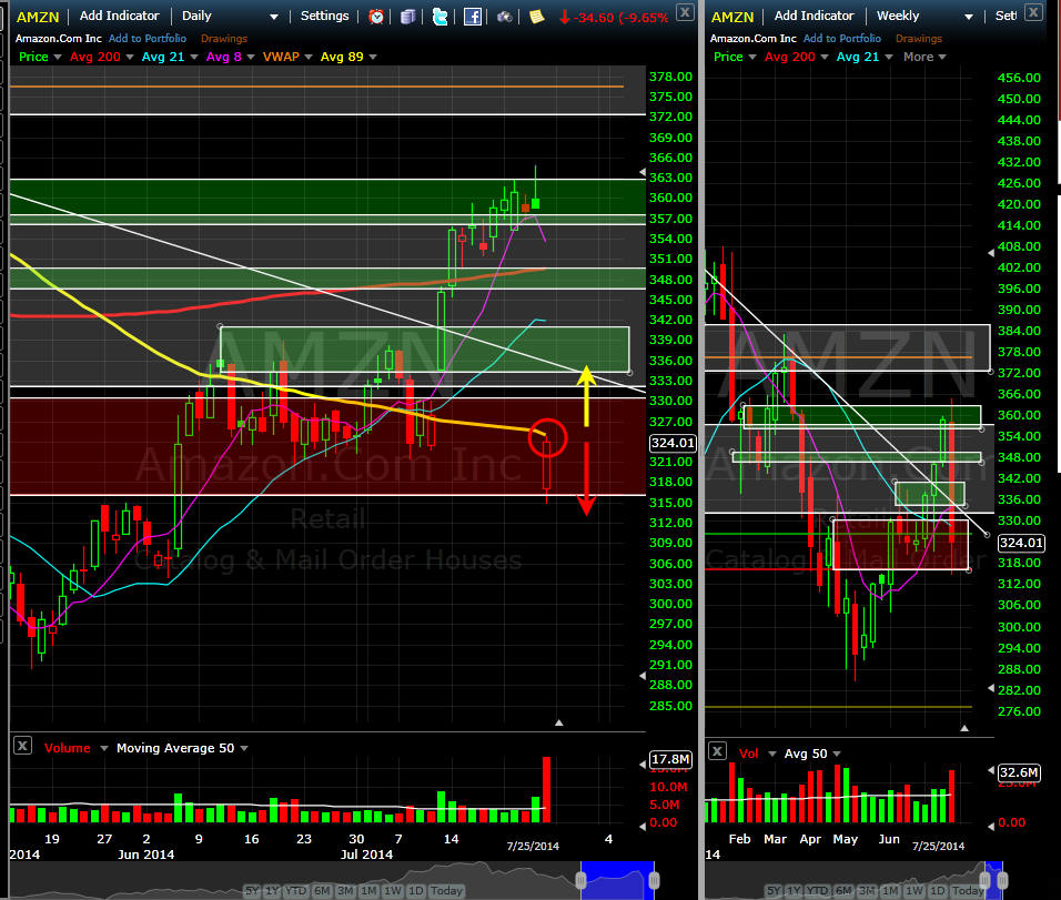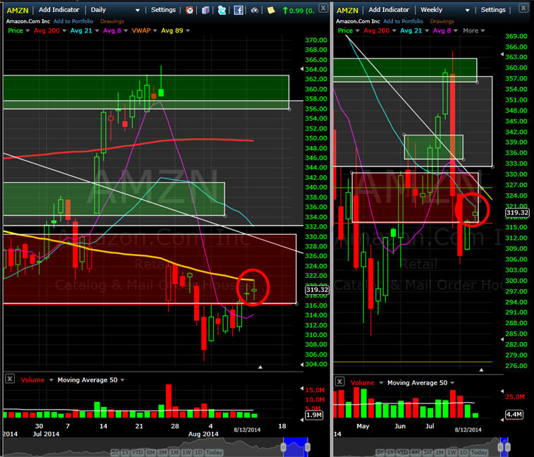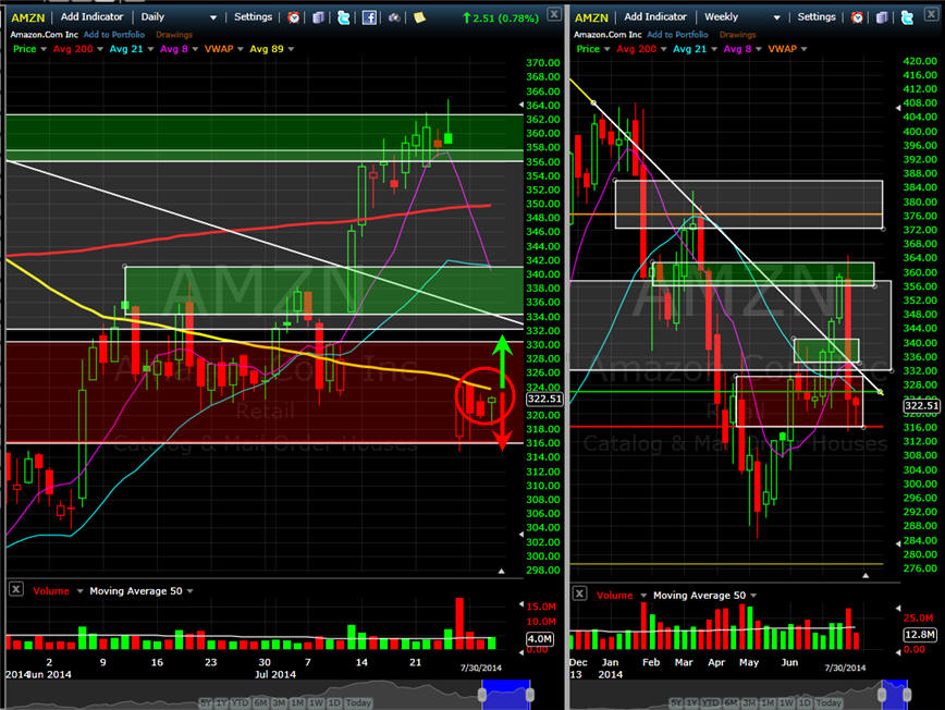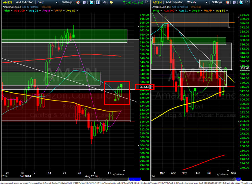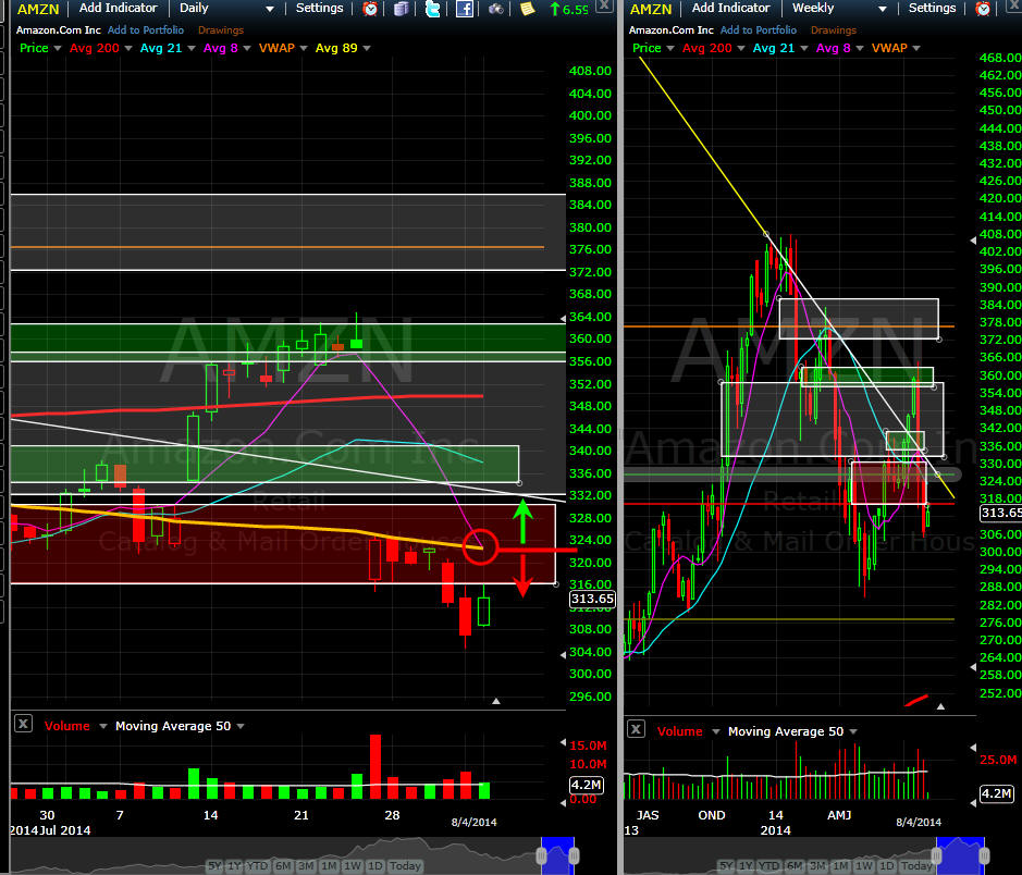 ====================================================================================================== 8/10/14 - So long as AMZN stays under the 89MA on the daily chart, it's a shorting opportunity, but that is always a slippery slope because of future compelling news lurking around this stock. Other than negative market news and/or meltdown, there is really nothing to tank this stock so short with caution in mind and take profits quickly until you get enough to finance a longer term short trade. This week is Aug expiration so we should be in for some volatility and that makes for us some great trading opportunities.