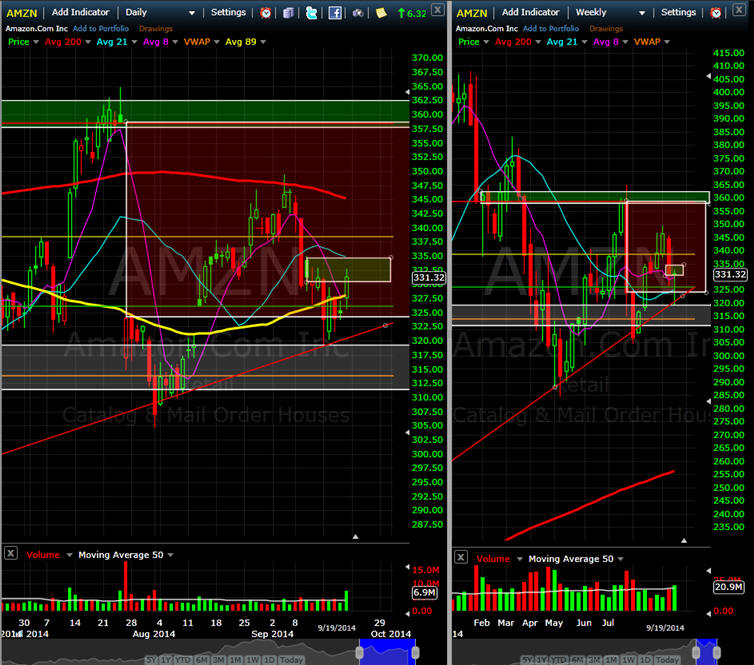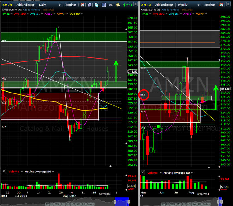 ======================================================================================================= 8/26/14 - Whoomp! there it is as I get my hinny kicked on my SGB signal and even though things started to go my way, a positive news story always changes things and POP goes weasel. AMZN announced they bought Twitch and investors / shorts had to cover. If this move has legs, then we will see a continuation tot he 200MA and higher, but if not, it will still be hard to get short now. Since AMZN did not open down from my last comments, I cancelled my put plays. This will put them in direct competition with Netflix and Hulu which means MORE EYEBALLS and content choice for the Behemoth emerging company. The stock has now retraced over 55% of the big post earnings drop; and so long as it hold $338.00, technical investors will be forced to step in and start to accumulate shares; and with the holiday shopping season approaching, we will most likely see AMZN edge higher if it an take out the 200MA. Many times, a pop like this is tested so I am fishing for a pull back on a Bull Put Spread.