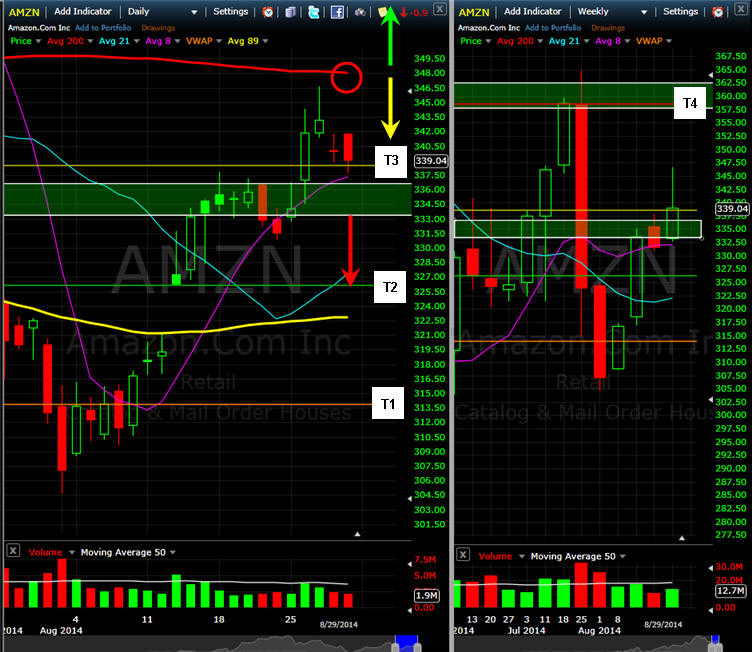 ===================================================================================================================== 8/30/14 - A test of the 200MA and so far investors are taking profits as AMZN announced yet another new venture...exclusive on demand content shows for their Prime service users. I know they have plans to rule the world some day...lol...but until this company can actually turn a profit, investors are losing patience and that builds fear to hold onto lofty stock prices. If you look over the weekly chart, the stock closed EXACTLY on my T3 line this past week and if that does not hold, we will get lower prices so short bias is on deck next week if AMZN traded under T3. Until the stock can wipe out the huge Bear Elephant bar on the weekly chart, it's vulnerable to selling pressure from nervous investors who got crushed.