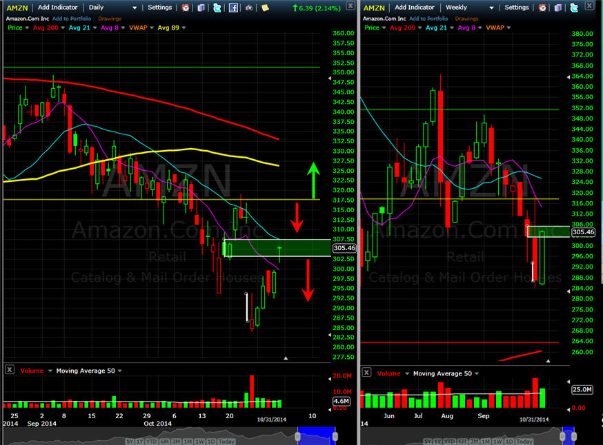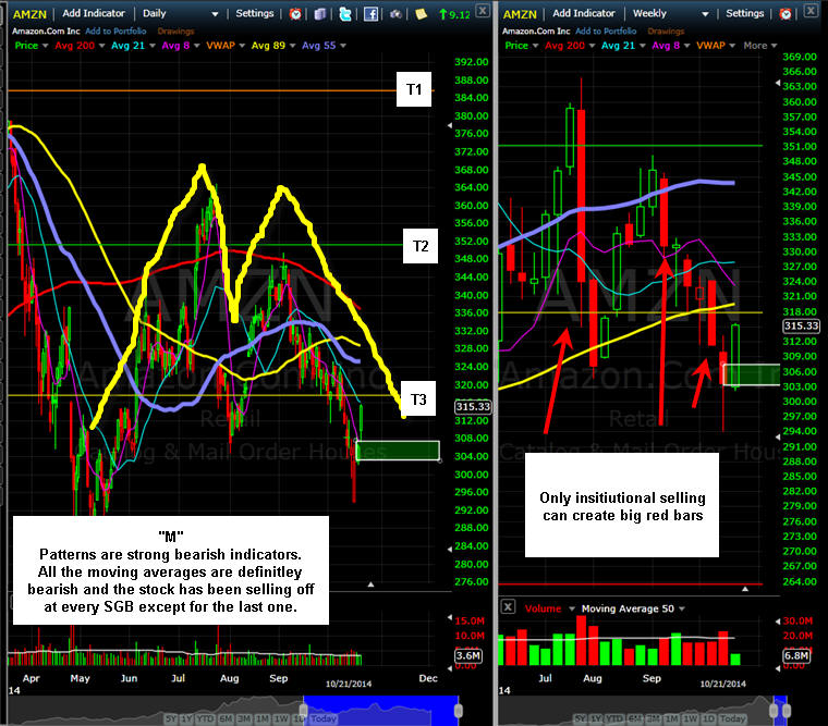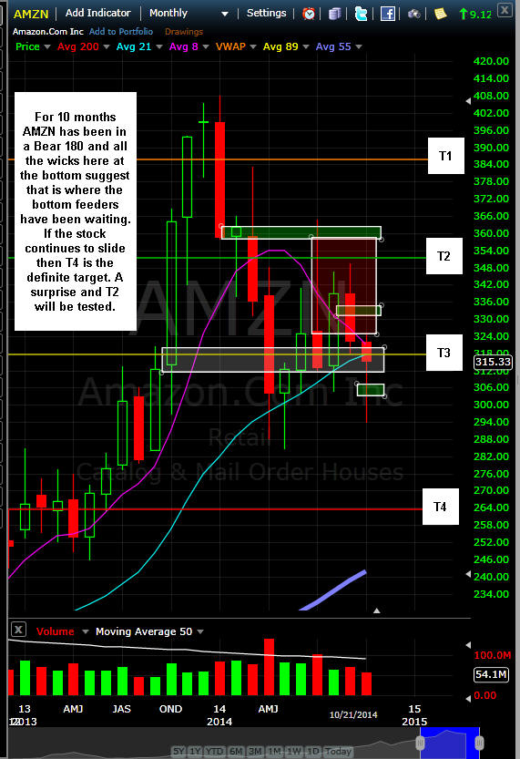 ========================================================================================================= 10/23/14 - BIGGER MISS than expected!! Amazon’s Spending Leads to Biggest Quarterly Loss in 14 YearsThe stock gets WHACKED in after hours. The BCS will be a 100% Winner and will cover the BPS losses. I did not get filled on the other trades. I will be fishing for a White Whale trade in the morning. Once things settle out, I will be looking for more BCS to sell. =========================================================================================================================== 10/21/14 - Thursday is earnings and we could see a pretty good move in the stock so get ready. Since my last comments, the stock has dropped down a fair amount from that SGB and Friday it put in another one only this time the stock rallied; however, I think that was due more to a market wide rally. There is also a lot of news on Tax Deals with foreign country that could be lifting the stock too. This company is destined to be the BIGGEST retailer on the planet and eventually they will turn the profit corner. Will they show improvement this quarter? Most likely not because the upcoming quarter is the biggest one for the company. The charts show the stock has been consistently getting sold down since September and that selling has been consistent and tight in range. This usually translates into lower prices and if they do not blow the doors off, I think we will get a nice drop. With a very big "M" pattern, that drop can be quite large. Currently the IV is at 106% indicating a move of +/- $25.41. This gives us a lot of potential for OTM premium selling. Short interest is at 7 million shares and 2.1 days to cover so not at extreme levels which means selling those OTM calls are a reasonable bet.