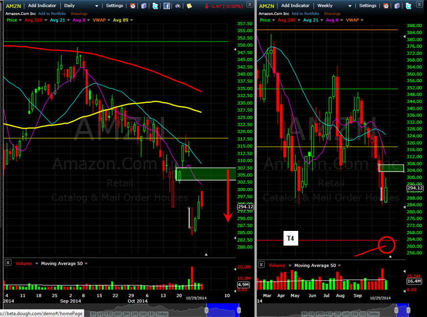 ======================================================================================================== 10/29/14 - The post earnings bounce may be over depending on how the markets react to Yellen's testimony tomorrow. As long as AMZN stays under the SGB zone, it's a short for me.
