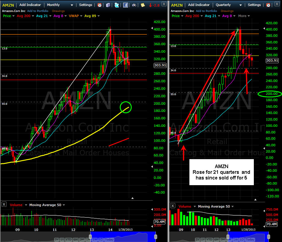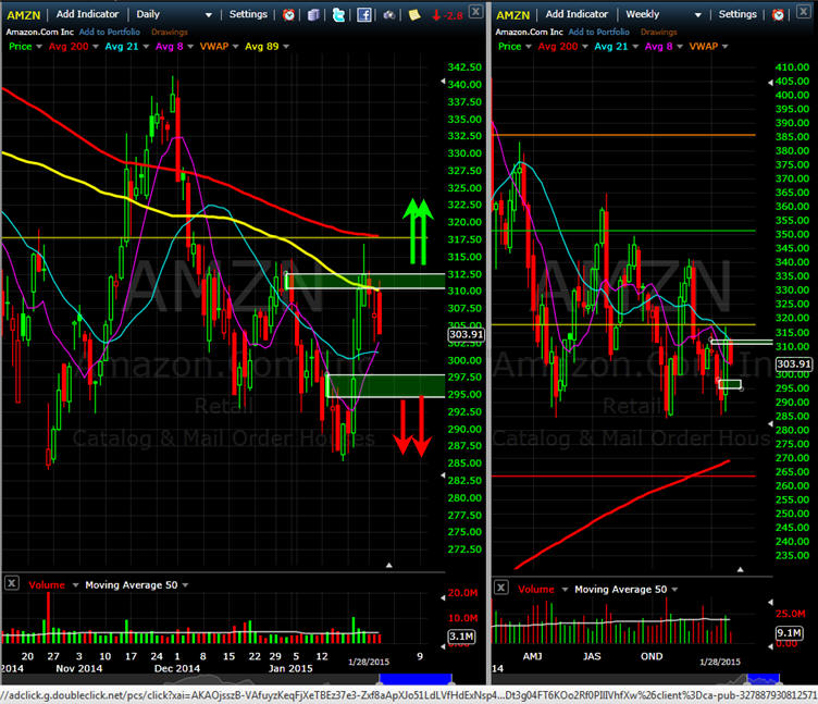 ================================================================================================================ 1/28/15 - Tomorrow is a big earnings release for AMZN. Last time the stock missed estimates and was whacked down $29.00; however, the stock found buyers down there and rallied back to $340 before profit taking kicked in again off an SGB. The past two quarters have seen this stock get beat down, and if they miss again, well, this time it could go down for the count, so I am going with longer term puts and short term calls for my Lotto Trade. The IV is pumped way up so buying calls is very expensive; and if the stock does not move PAST the expected MMM of +/- 22.00; then profits will be minimal to none, so only risk what you can afford to lose or just sell some vertical spreads and collect some premium. Today, the stock peaked out in another SGB zone and closed down at the lows, but that was possibly market induced by the Fed sell off. There was a news story that the company launched an email service for companies which is yet another venture outside their core business model. This can be viewed as good or bad as the company continues to spend into expansion with different vertical markets. I guess if you do everything, you will have everything right? Well, how about some freaking EARNINGS for a change...lol. I think guidance will be the big factor here since this report is basically the final quarter of 2014 and they guided lower last time. Maybe they are sandbagging and 2015 will be the kick off to profits. Well, it will have to be the case going forward, because investors may finally be tired of giving AMZN a pass on a miss, but you just never know and based on the past two quarters, I think institutional money has grown tired of the if-and-come attitude of the company and is now looking at the actually valuation models they use to base a real price on the stock—if that be the case, this stock could easily sell down this year well over $100. The stock is well within striking distance of the 200MA on the weekly charts and that is a definite first target should they miss. The monthly chart is looking very bearish and that makes a downside longer term move to the 89MA a strong probability of the stock loses the $280 price area.