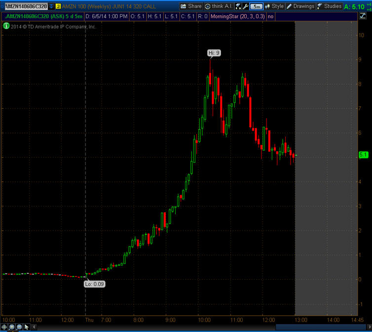 ============================================================================================================= 5/6/14 - OMG can my timing be any WORSE...arrggghhh! I have a short bias, and, well, news of a new 3D Smart Phone CHANGED THAT today!! 10:27 AM EDT, 06/05/2014 (MT Newswires) -- Amazon (AMZN) is planning to unveil a smart phone with 3D technology at its Seattle headquarters on June 18, various press outlets reported citing an invitation sent out by the e-commerce giant on Wednesday. I was so pissed off that I did not find out about it until 8am PST, and by then, AMZN was already up $13.00. Needless to say, had I known when the news story broke, I would have been all over this one with 100 contracts.