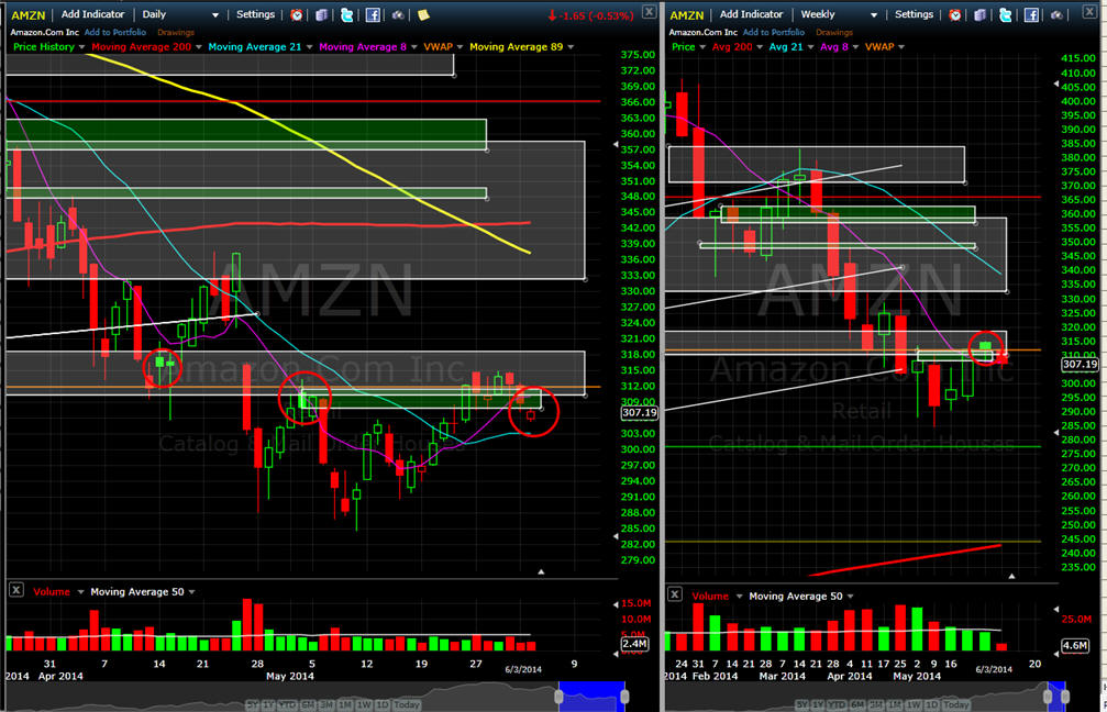 =============================================================================================================== 5/31/14 - I am looking over charts and AMZN currently closed the week with my infamous SGB short signal so I am going to test the waters next week with a couple of Bear Calls Spreads and will add more bearish plays if the stock falls back under $307.00. If the stock rallies, I want to see it fail the current gap zone it's in before I add more bearish positions.