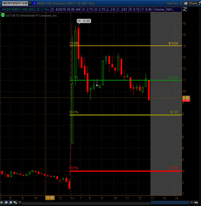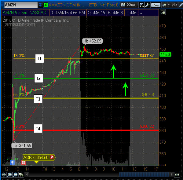 ================================================================================================================== 4/26/15- Where will the stock go from here now that it has made all time highs? The consensus is a lot higher so long as the overall markets continue to expand higher. The multiple this stock trades at is ridiculous, but that is what the naysayer pundits have been saying for years about AMZN yet it just keeps going up up UP. How we approach this stock now is with premium spreads and fishing orders. If you were watching the IV then you know they had that pumped up over 110% and by the end of trading Friday, it was deflated down to 30.53%. Selling premium is 90% guaranteed money when IV is that high so going forward, we start looking for more of those types of trades to build profits for the Lotto Trades! The stock did not pull back at all Friday, so we will see if investors still have an appetite for more this week. I am looking for a little profit taking and will try some calls if the stock pulls back to T2 and T3. I am always observant of price action especially when stocks pivot or close on Fibonacci sequence numbers; and Friday the final trade was at $445.10 with a positive close up +55.11. To me, this is "code" the powers that be use to telegraph future moves in a stock. I know it sounds like tinfoil type conspiracy stuff, but you have to believe that old time traders like me have superstitions and decades of experience; and I have to tell you after trading hundreds of thousands of times; watching markets every day for the past 17 years; and looking at tens of thousands of charts; there is SIGNIFICANCE in the Fibonacci sequence.(1,1,2,3,5,8,13,21,34,55,89); so when I see stocks closing with exact Fibonacci numbers, I take notice and use that as my pivot points—a guidepost if you will.
