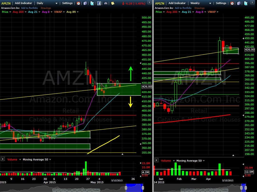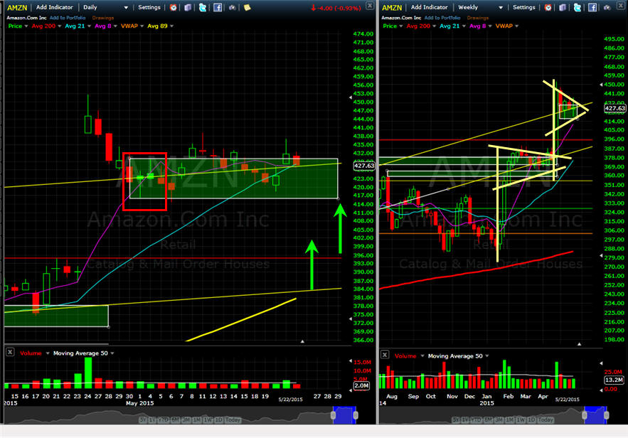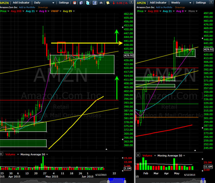 =================================================================================================================== 6/9/15 - NFLX getting 5 billion shares to throw around and a split coming may put a little bit of selling pressure on AMZN as investors decide who will be the king of on demand content. The stock is currently testing the SGB DOJI zone so a move back under $421 is a short and above $430 a long candidate. The stock has basically traded sideways for weeks now indicating investors are happy with their investment, but fund managers are not so willing to jump in during the summer doldrums. The weekly chart is a nice looking Pennant but that is the challenge, it is TOO obvious so the opposite effect is likely. I am going to fish for some puts this week and some calls for next week.