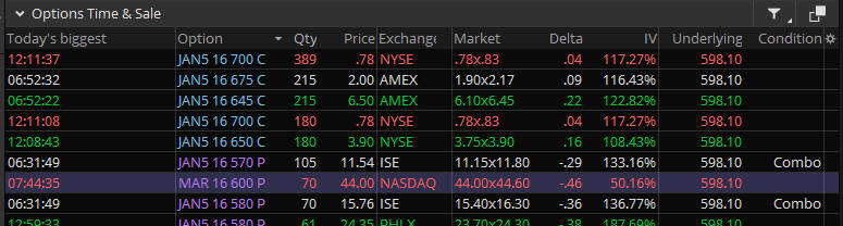 An interesting big bet placed today on 700 calls that expire tomorrow. This move is over 2x the MMM of 42.19. It seems to me this could be a MM Tell or Bluff attempting to get investors to buy calls as the Market Makers are probably selling into them. This is a $55,000 1-day bet and is very suspect to me but anything is possible.