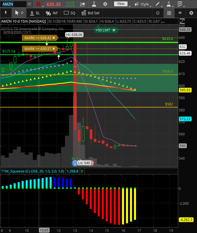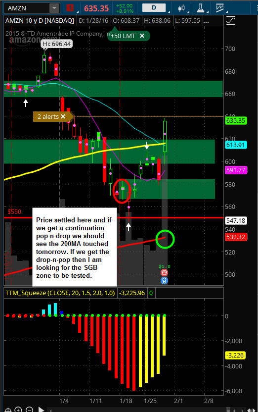 1/27/16 - Tomorrow is earnings and can AMZN explode $70+ like it did last time? The markets are not bullish but investors are getting itchy and this could be a HUGE trade. We had a perfect setup today with a nice drop so the call premium has been deflated; however, it is still very expensive with IV pumped up at 127%, so if you have a small account, you should consider only doing spreads.