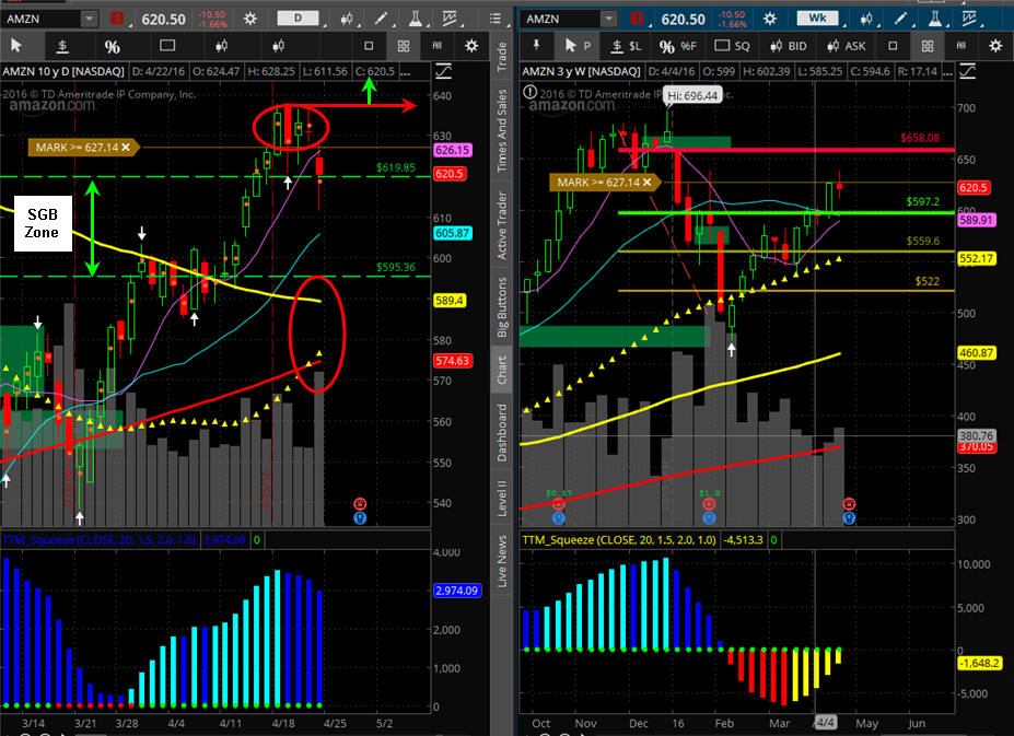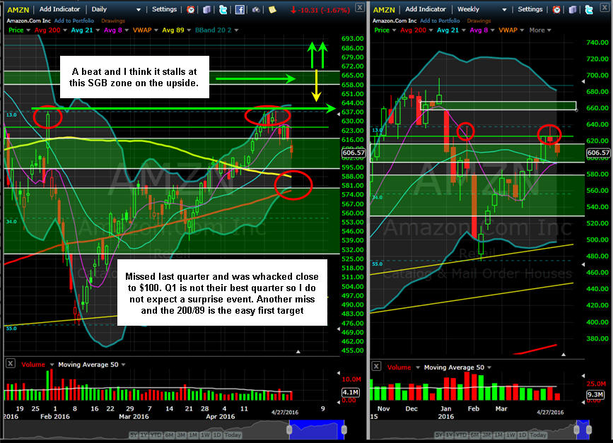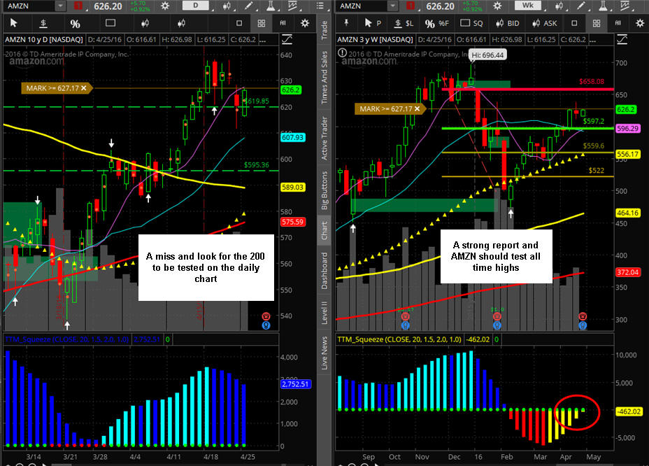 ======================================================================================================== 4/27/16 - Tomorrow is the big day for AMZN and the bets are flying all over the place. This stock is expected to report another profit but will it be large enough for the big money funds to keep buying it? Last quarter the stock missed estimates and was crushed nearly $100 so if they miss again, the downside should be bigger than the MMM and if they beat, I do not expect it to move much more than $60.00 to the upside but you just do not know until it happens so we plan for and play what we get.