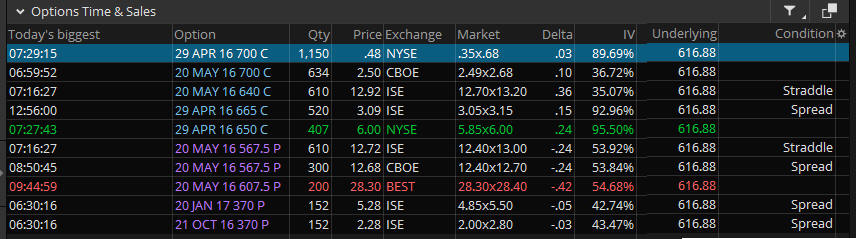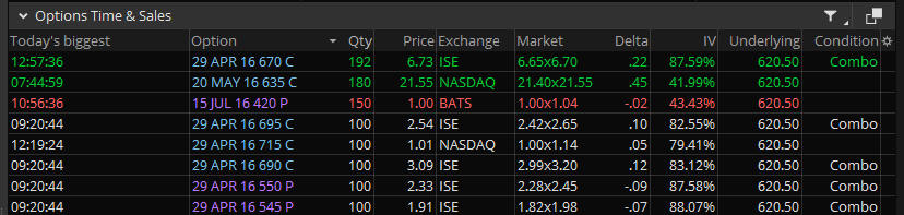 4/28/16 - AMZN crushed estimates nearly doubling them and making over $29.1Billion in revenue...wow. The stock was all over the place today with an initial move up over $16 then a crushing blow with the markets turning over when the Karl Icahn news hit dragging everything down with AMZN closing negative on the session. Once the earnings news was out, all those investors who were getting short all afternoon just got their heads whacked off in a missive short squeeze in after hours. So, will there be anyone left to buy tomorrow? I think we may get a push to $700 in pre-market and if it fails there after the open I am going for a WW put trade if it fails to take out the all time high in pre-market or pops over and drops under in the first 5-15 min candle—and if we get profits on the OTM calls I plan to take them after the open.