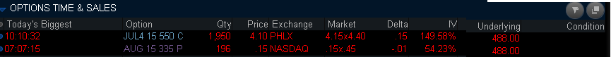 4/22/15- Lets hope AMZN performs better than FB and CMG and we get another NFLX winner again. It appears this earnings cycle has been better to just sell premium spreads, Iron Condors or just naked strangles to capture profits. AMZN has been on a strong move from the last earnings and a steady climb into this one, so I am looking for a decent move and since the stock is just under all time highs, a surprise could take it much higher than the MMM. The problem is the IV is pumped up at 128% making the DOTM calls very expensive so we would definitely need a move greater than the MMM to make strong profits. Any move at or under will result in very small gains to 100% loss. A couple of large trades today with a bias to the down side. There are more calls than puts so a big miss would make for a strong move down, but a meet or slight beat may give us momentum like NFLX. So, I am thinking the MM are expecitng people to play it like a NFLX and instead they try to keep the stock beat down and suck up all the fat IV. I am going to sell some premium spreads and take a shot that AMZN may trade beyond the MMM.