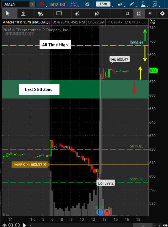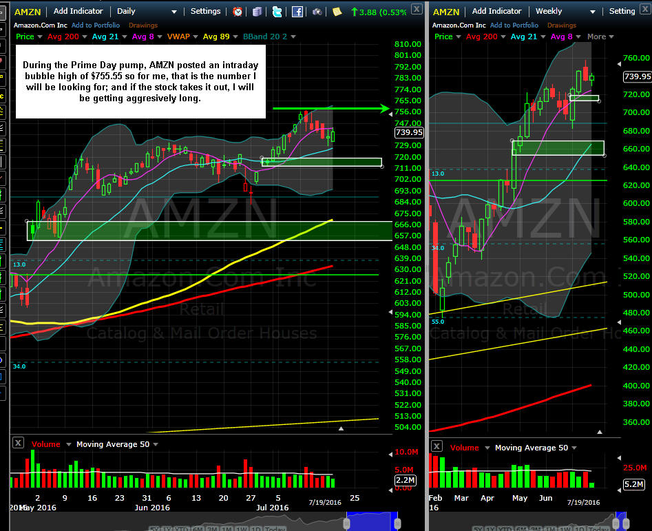 ================================================================================================================================== 7/19/16 - What rise we have seen in AMZN since my last comments. That double DOJI SGB turned into a launch pad as the markets added some fuel to the fire lifting everything. Once AMZN made the move, the next catalyst was their 2nd annual Prime Day event that kept the momentum going. After the event was over, investors took profits and now it appears the Bulls are ready to take off again. If we manage to get a pull back to the SGB zone, I would definitely be buying some calls but for now I will start on a couple and fish for better entry prices because the IV will continue to increase as we get closer to next weeks earnings release. Unfortunately, AMZN is a very expensive stock so if you have a small account, you should be cautious and wait for some better lotto trade opportunities next week the day of earnings or try some Butterfly Debit Spreads where you can get in cheap and the rewards can be pretty strong.