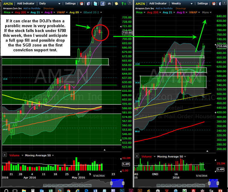 ============================================================================================================= 6/12/16 - Double DOJI SGB's has AMZN poised to take a much needed break and maybe even a gap fill down to $680 if the markets get dumped this week of Triple Witching expiration. This stock is in a very strong UP TREND and also very popular right now, so any dips will most likely be buying opportunities for investors who missed the huge post earnings move. The stock pulled back on Friday testing the 21MA on the daily chart so now the next logical MA test is the 8-Train on the weekly chart which intersects around $700 so I am gong to try a Butterfly just under $700 for this week and fish for some Lotto 720 calls and swing wild card lotto puts for month end down at the last SGB zone.