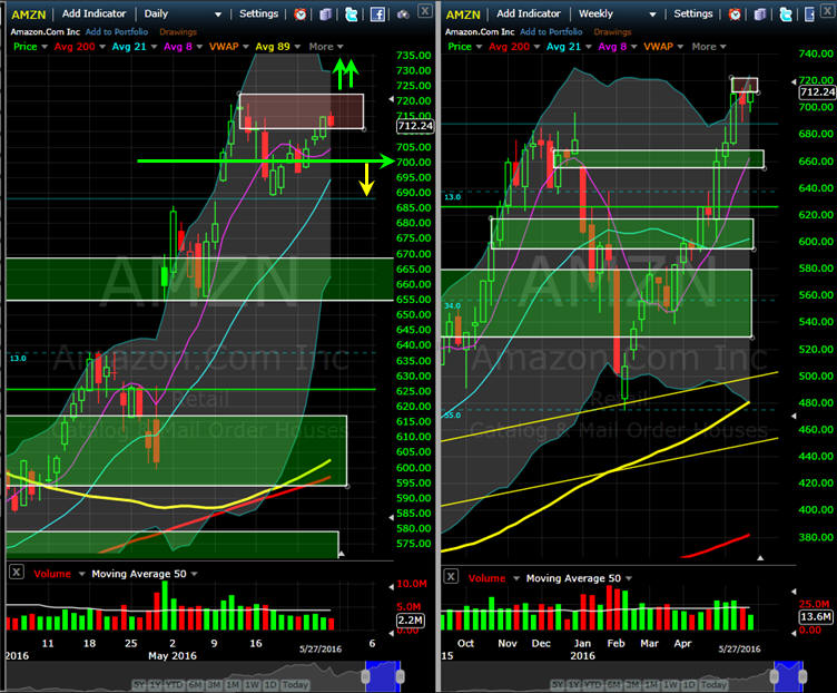 ================================================================================================================================= 5/20/16 - As I predicted, the stock made the $700 pull back and dropped into a gap fill where investors were waiting to jump in. Not the stock is testing the DOJI top and looks to be ready to make the next move coming out of the "sell in May and go away" phenomenon that did not produce the expected outcome in the markets. Now that the FOMC news is out and digested, June is looking to be an interesting month of trading as investors prepare for a rate hike that will NOT have any negative impact on the markets, or so it is believed by most. With all the momentum that AMZN has built up, the weekly chart is looking good for another let up and $750 is the target in the minds of most investors. If things turn south, then bargain hunters will be waiting around the 8MA on the weekly chart or $680 area. Of course if there is any negative news or downturn in the markets, AMZN is vulnerable to a lot of profit taking so I want to have some wild card Lotto puts in play as we move forward into June.