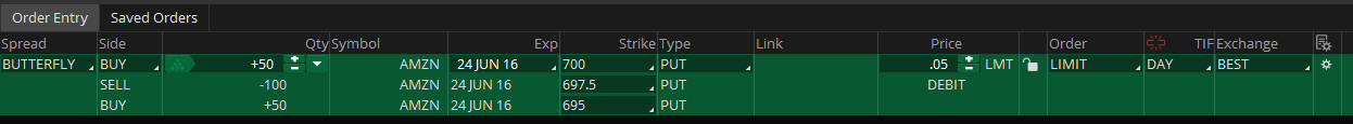 Here is an example of the 697.50 Butterfly with a $0.05 Debit that I am looking at buying tomorrow.