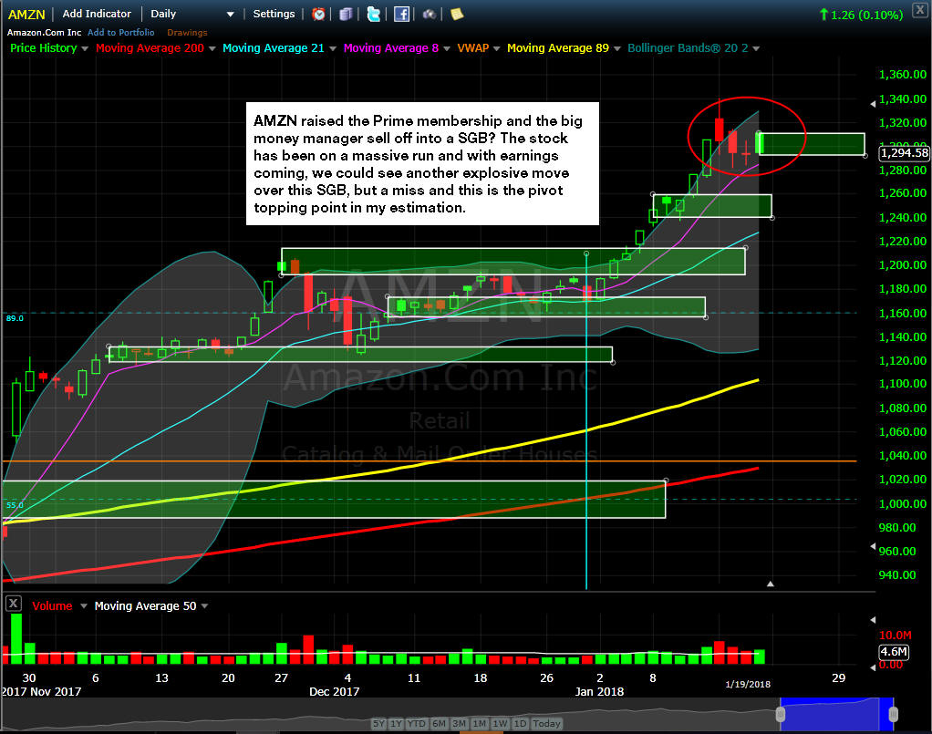 Ok, so we have started the new year off with a BIG BANK on AMZN calls, and then Friday, AMZN announced they have raised the Prime membership to $12.99 per month (an 18% increase) which had the stock up over $20 in pre-market, but then it was hammered with profit taking all day, closing back under $1,300 giving us a SGB close too! — is this a lucky Fibonacci signal or unlucky black cat sell the news topping signal?