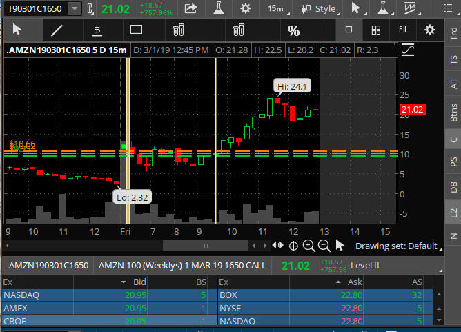 Although AMZN did not fit the Lotto Trade formula, I still took a stab at some 1650 calls when it moved over the SGB zones looking for a quick profit and then the news breaks after I sold. Once I saw it was gaining momentum, I jumped back in on the 1660's; but now the price to play was much higher than I wanted to be in at; so I was just too tight on the stops, and unfortunately, I did not get the full potential by the end of the day.