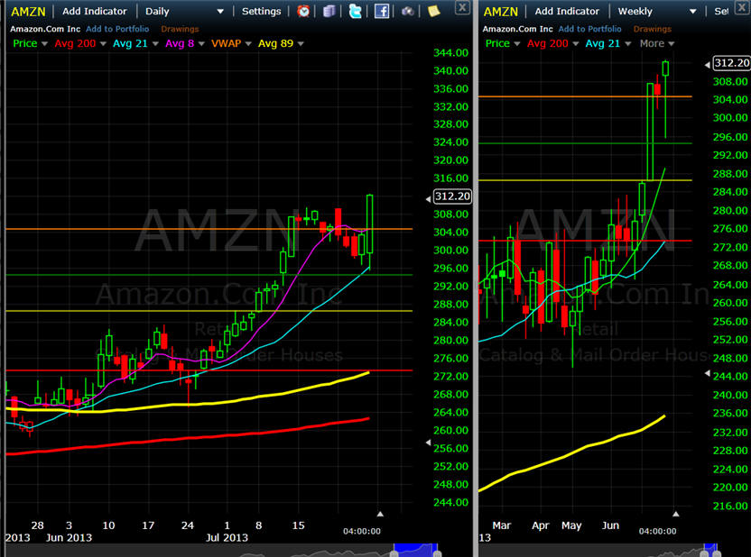 ======================================================================================= 7/26/13 - Shorts forced to cover on multiple upgrade BS and general momentum as AMZN puts in a new All time closing high today. I expect this euphoria to wear off and profit taking to kick in next week as earnings season winds down.