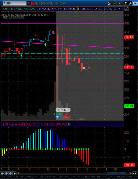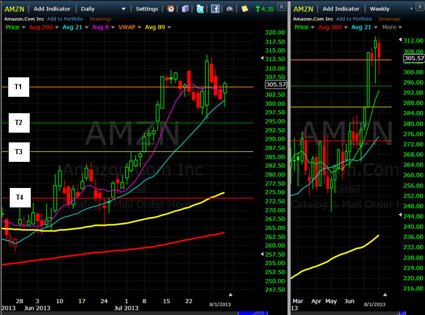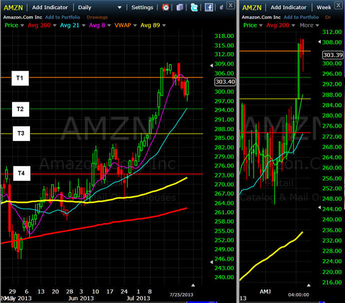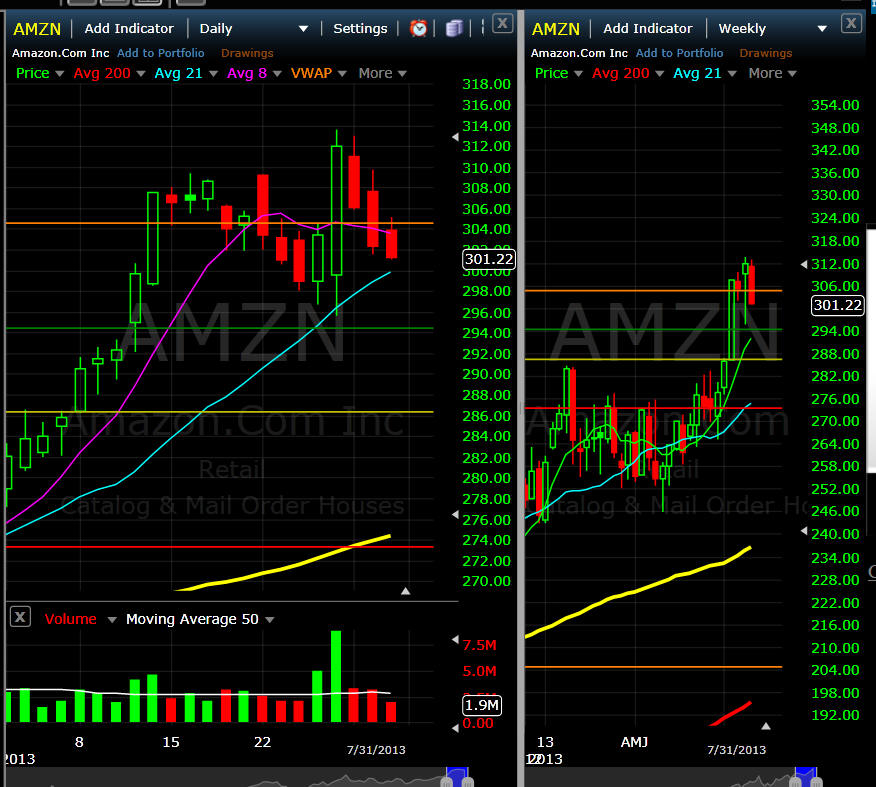 ========================================================================================== 7/31/13 - AMZN closes July trading with profit taking after an impressive short covering rally off Bad earnings? This stock always seems to go against common sense but I am hopeful it will drop below $300 soon. My challenge is it will most likely not fall enough this week to make my puts any profits. I think my Aug expiration have a strong chance but we will see. The stock is back under T1 so if it stays under that its a SHORT. I closed out my Bear Call spread for a nice profit and I am will be looking to sell some more premium if AMZN does drop under $300