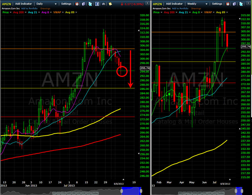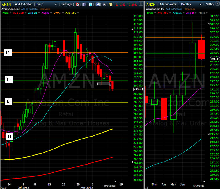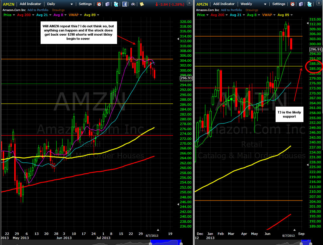 ============================================================================================================ 8/8/13 - AMZN attempted to hold $295 on Friday but I think it is still vulnerable to more selling if the markets make the turn lower next week which happens to be Aug expiration so expect some volatility. I will be adding some more Puts if AMZN does pop back up this week and fails to get over my T1 line. My 300 puts are still profitable so I am putting in a break even stop.