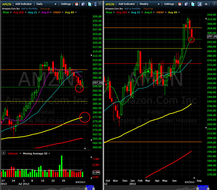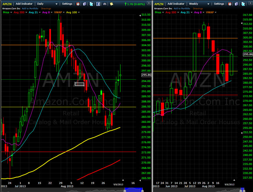 ======================================================================================================== 8/8/13 - Momentum picked up today but AMNZ managed a slight comeback closing above my T2 target. I still have a week on my puts so I am sticking with them and adding more if the stock gets back over $300-$305.