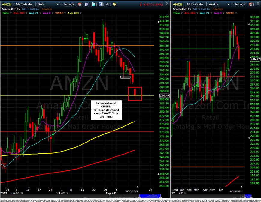 =========================================================================================================== 8/15/13 - What can I say, I am the technical genius again and again! AMZN made the final pull back as I predicted and EXACTLY touched down closing today on my T3 line. We should now see a bounce start tomorrow or early next week with any market rebound. Any dip tomorrow and I am picking up some calls.